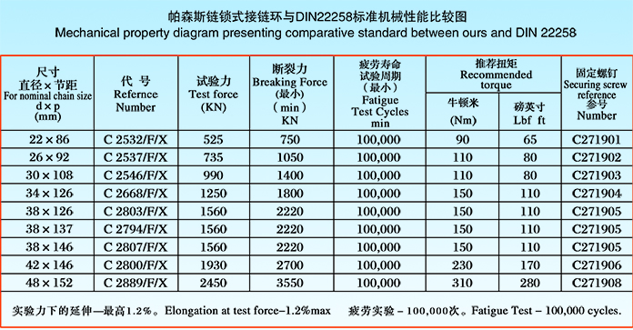 帕森斯鏈鎖式接鏈環與DIN22258標準機械性能比較圖