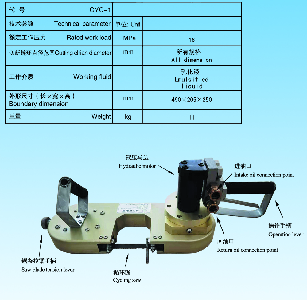 GYG-1型液壓切割鋸專門為 煤礦企業生產現場設計和制造的。其主要功能是為了鋸斷各種規格的圓環鏈鏈條及鏈環,還可鋸斷多種管材和型鋼等。工作介質為乳化液。