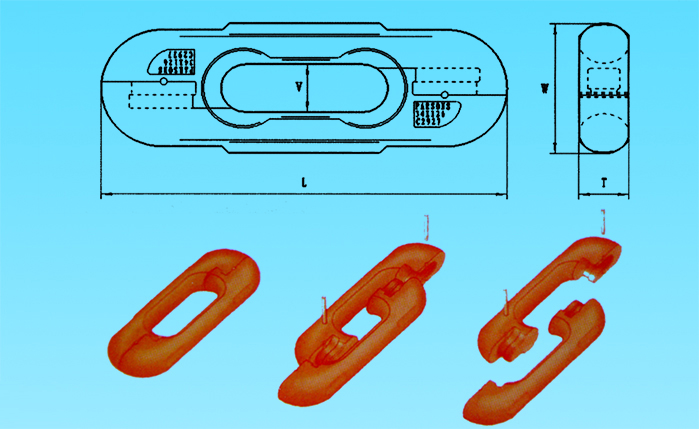 這種接鏈環只可垂直使用,其外形大小符合DIN 22258 part 3標準要求,并經過精心設計,以確保與配套鏈輪的配合。 “V型鎖”接鏈環的重量比其它類型接鏈環較輕。V型鎖式接鏈環裝配一定要注意裝配方向,保證箭頭方向與傳動方向一致。